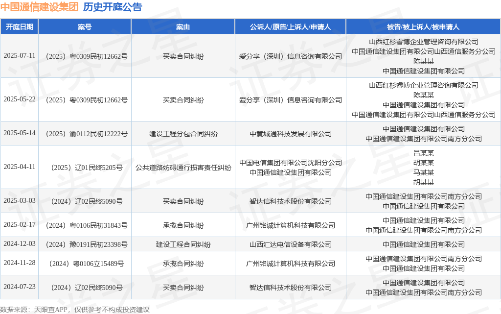 本站消息,根据天眼查APP显示,近日公布了一则中国通信建设集团有限公司作为被告/被上诉人的开庭公告,详细内容如下:
